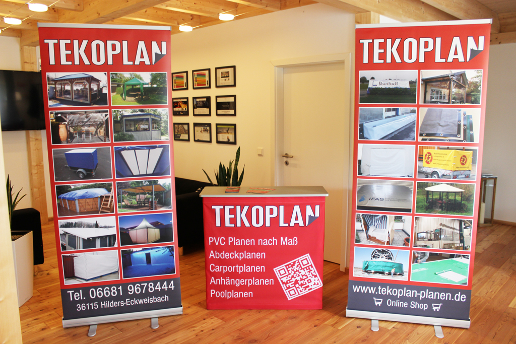 Wir haben für einen Messestand der Firma Tekoplan aus Hilders Faltteken, Rollups, Flyer, Beachflags und eine Anhängerbeschriftung gestaltet.